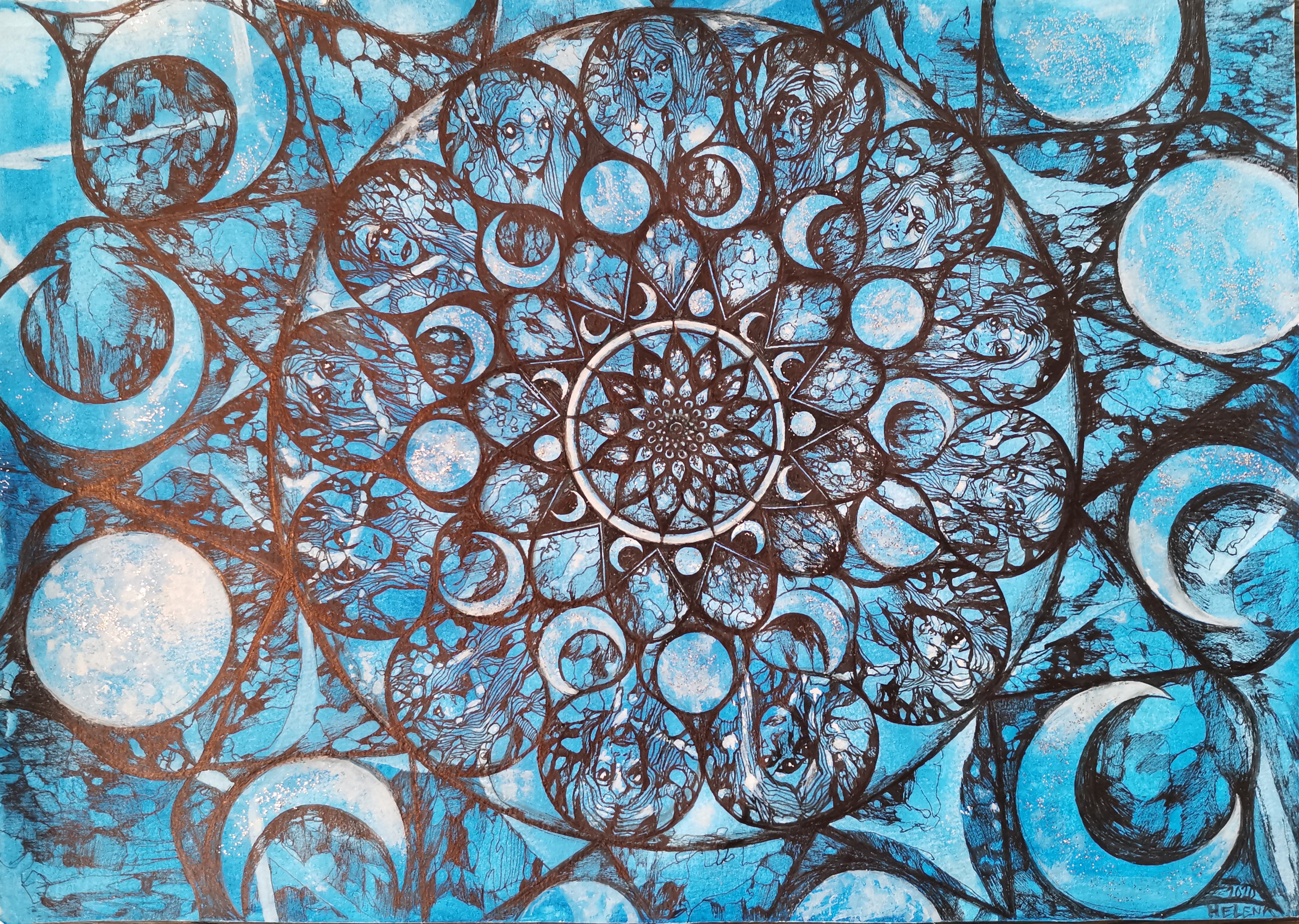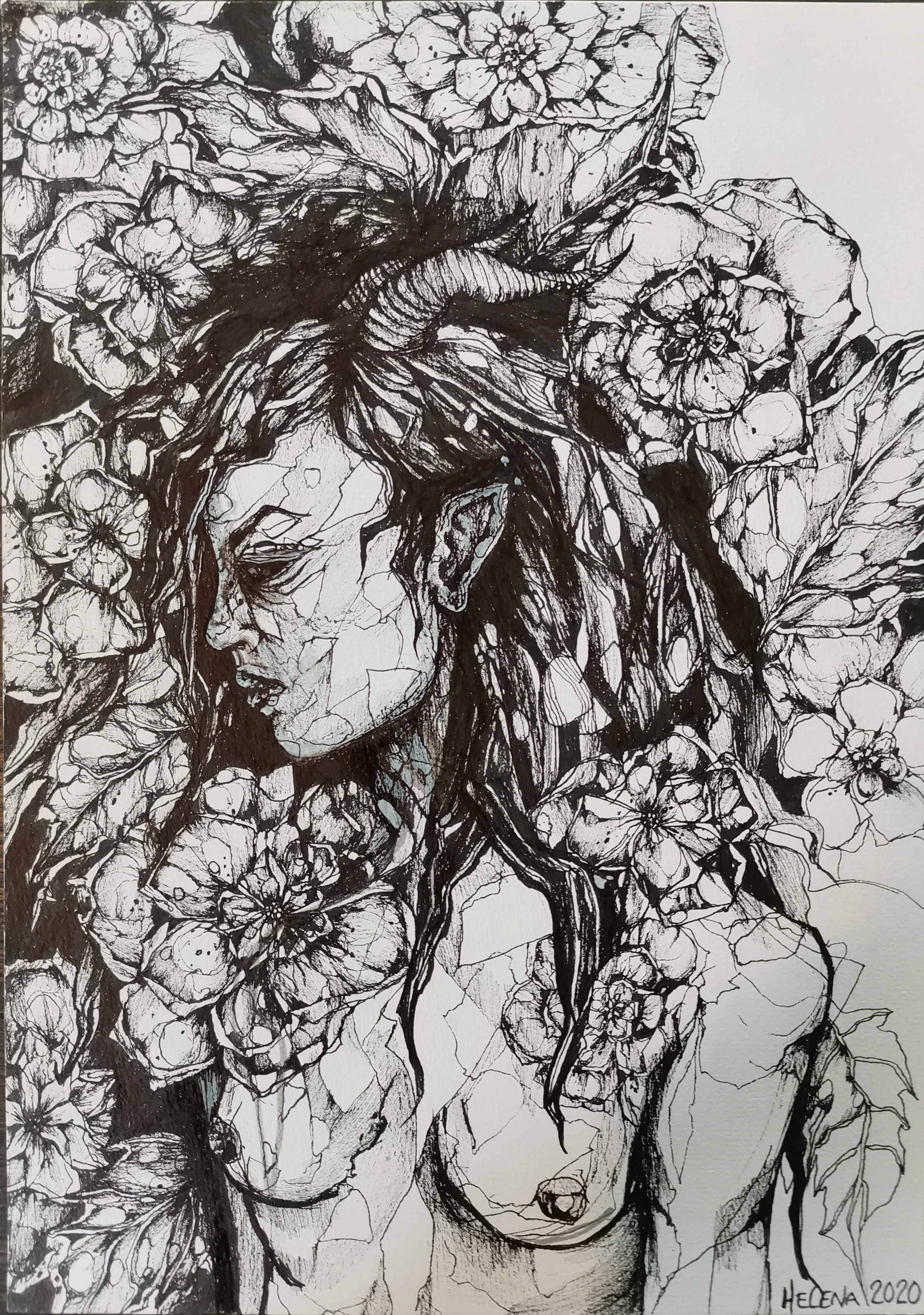 Jag arbetar på fri hand med finelinerpennor, ibland mixat med akryl, vattenfärg, posca, kol, färgpennor, mm.