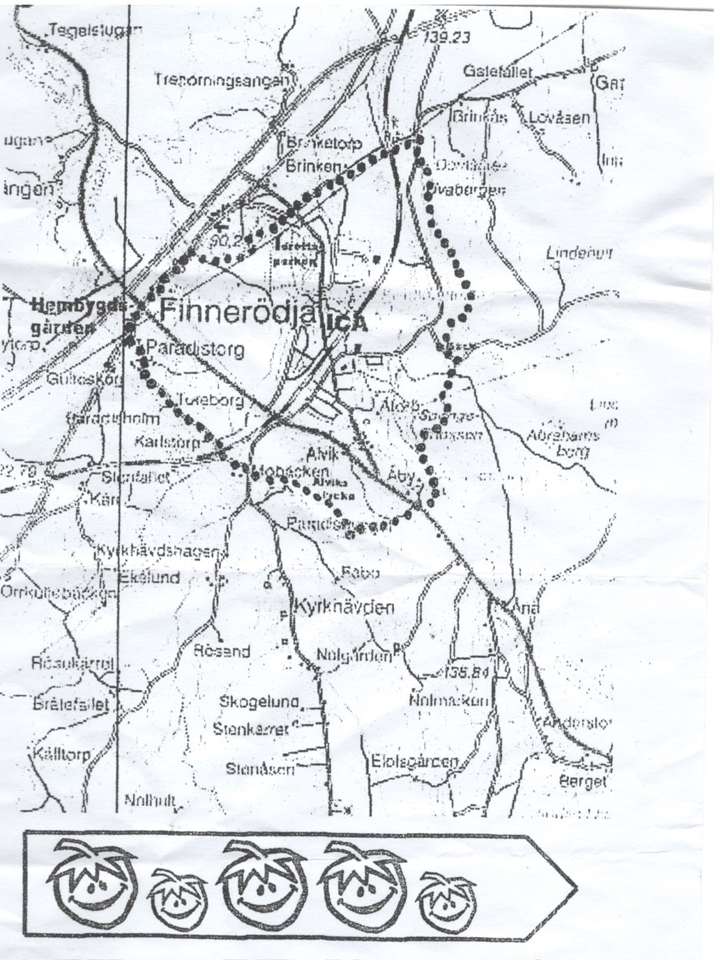Jordgubbsleden är en 9 km lång rundslinga. Den går i en lång sväng runt Finnerödja samhälle. Karta finns.