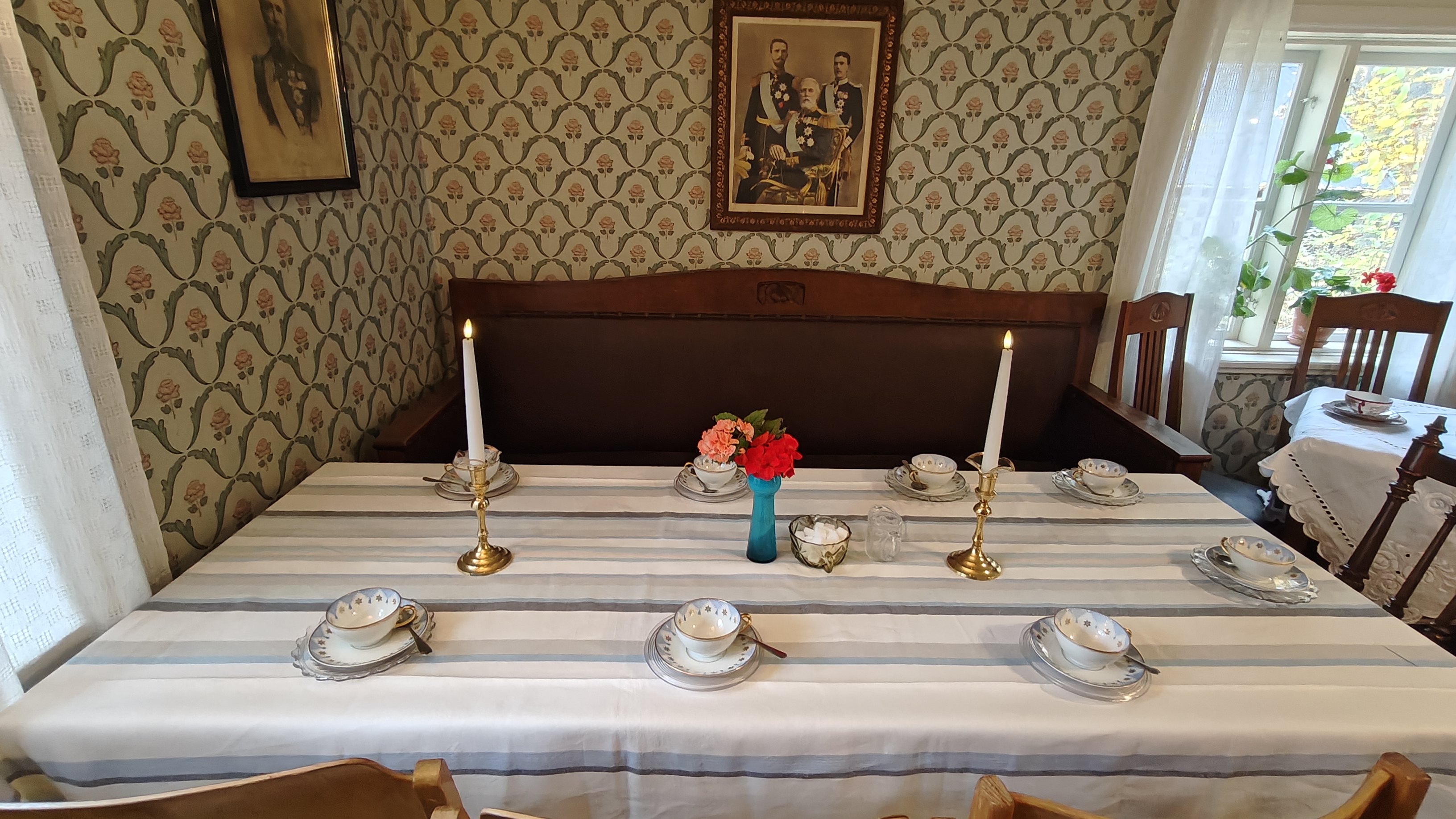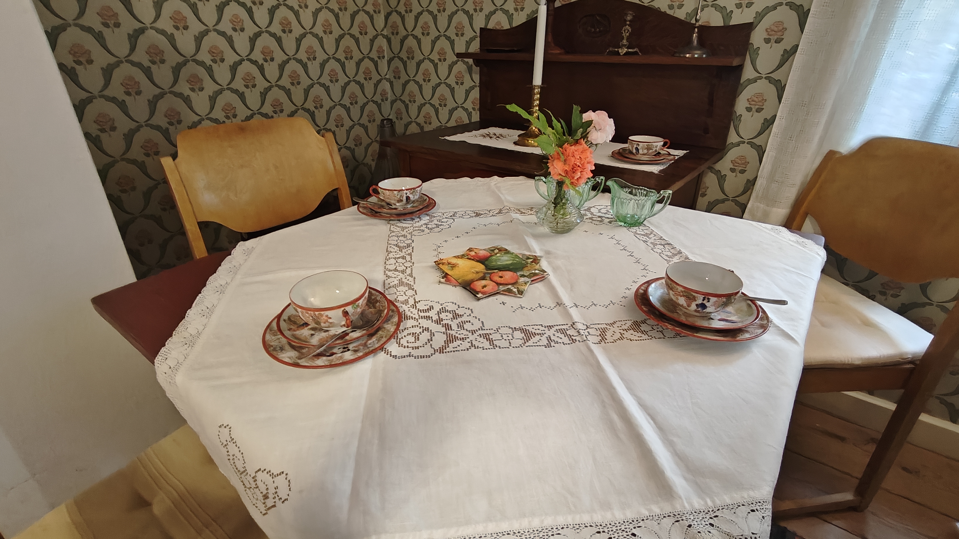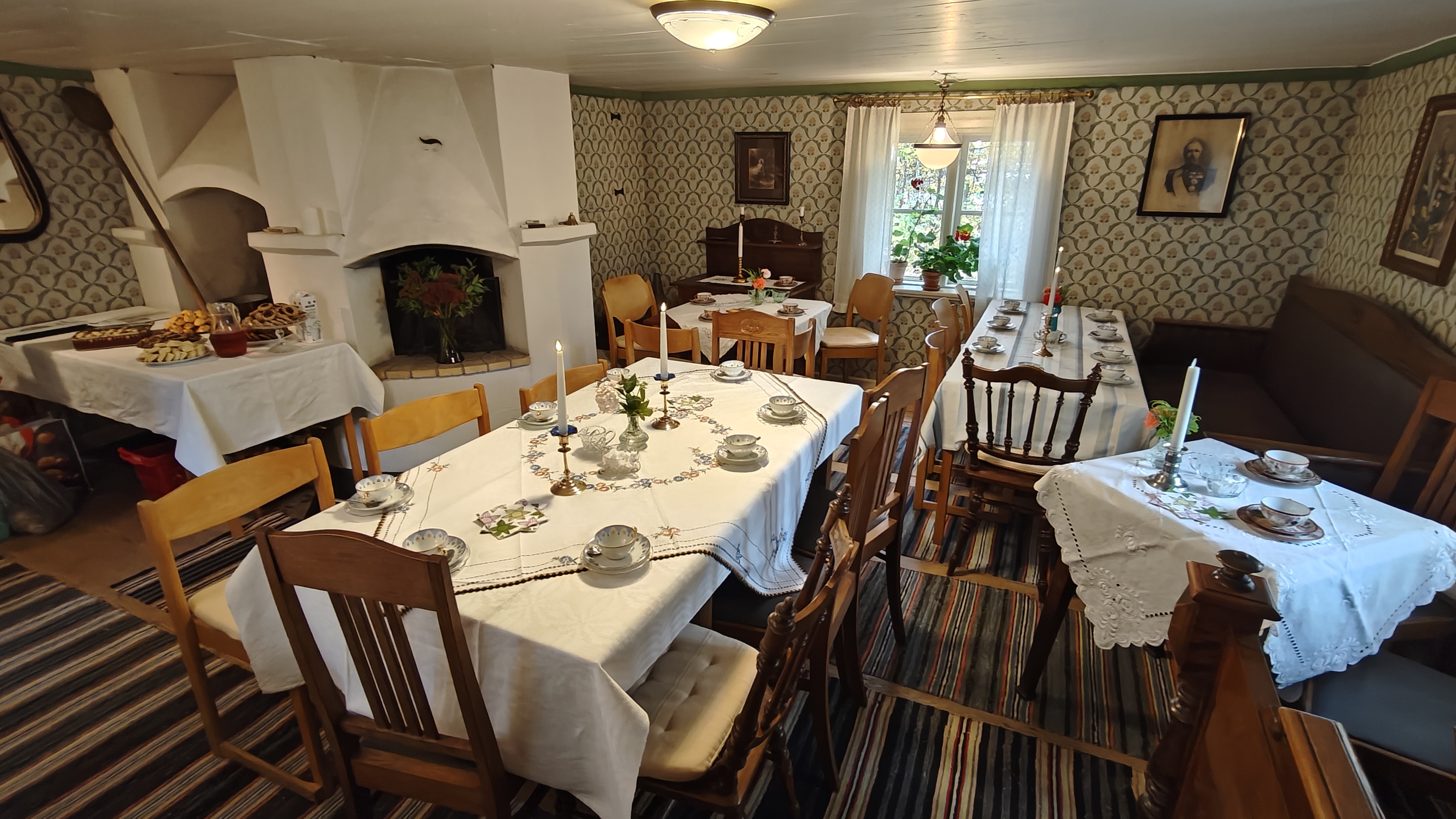 Naturligtvis stannade dock inte evenemanget vid det. Våra besökare möttes också av ett uppdukat kakbord bestående av den traditionella kafferepsetikettens sju sorters kakor samt tårta, och därtill ett bord med glutenfria alternativ. Men också inte mindre än nio bord fördelade på tre rum, dukade med anrikt porslin samt vävda och broderade dukar. Bland det mest iögonfallande i den bemärkelsen var kanske det vackra porslinet som dagen till ära kom till användning. Dock fanns det även enklare sätt att inmundiga fika: På förfrågan serverades en bricka med godsaker och kaffetermos på bänken framför Stena-Gustavs stuga. 🙂