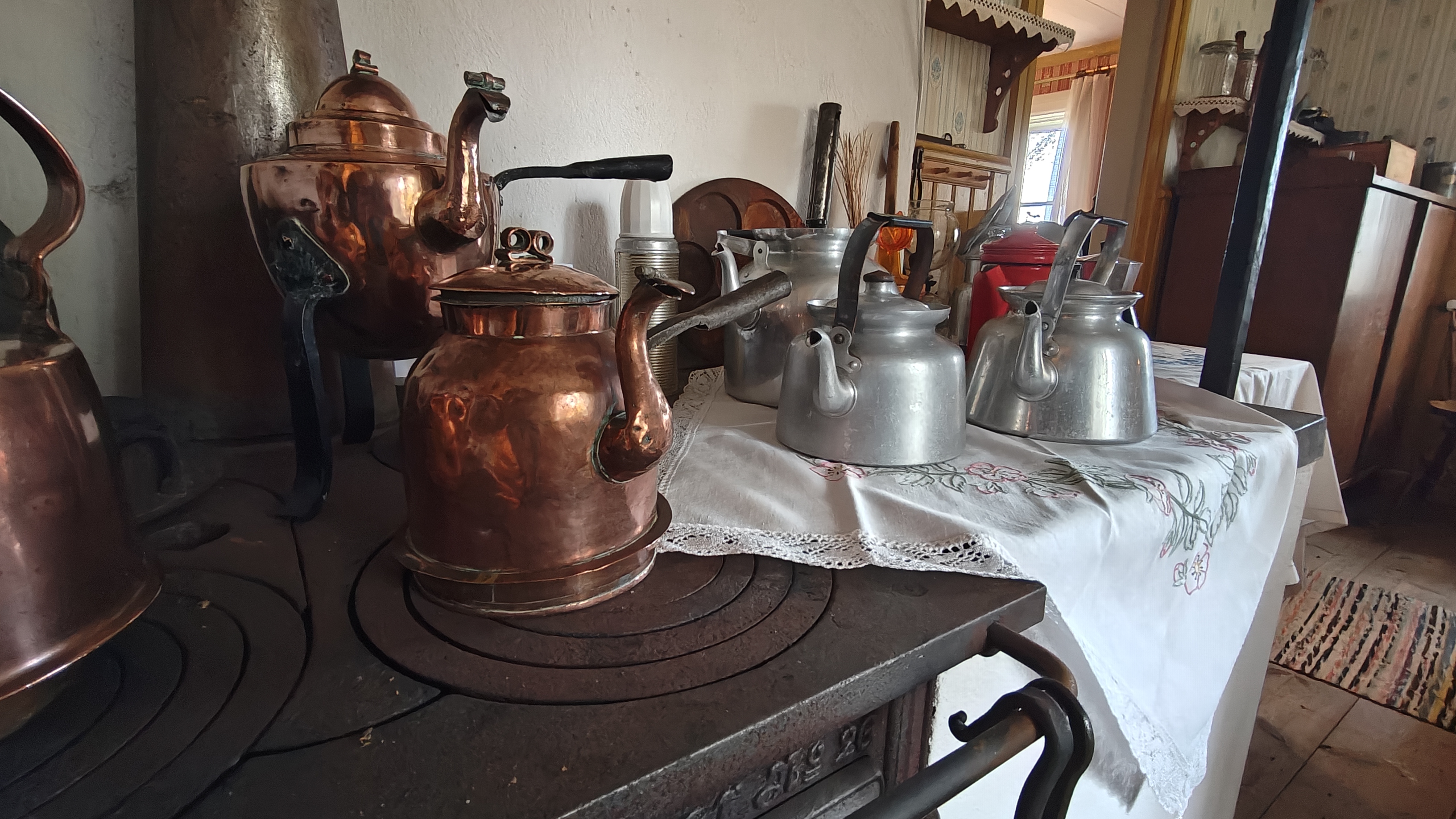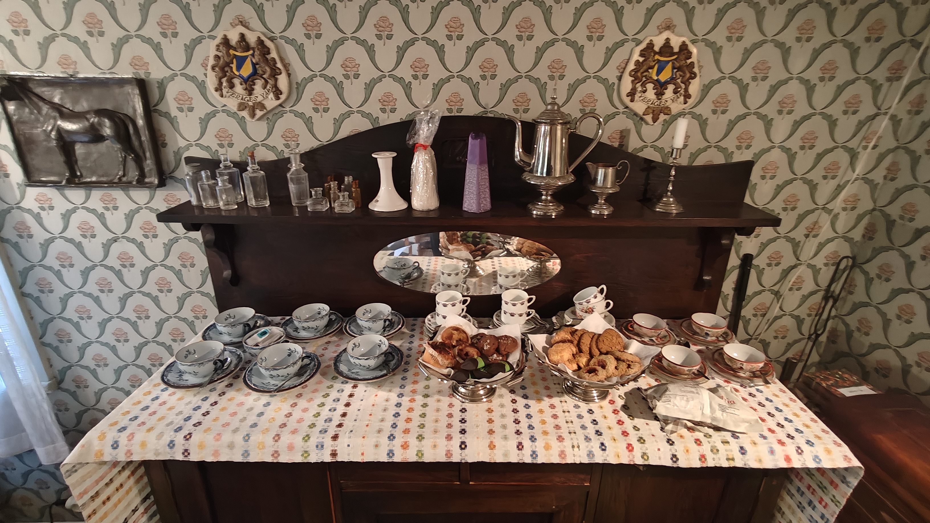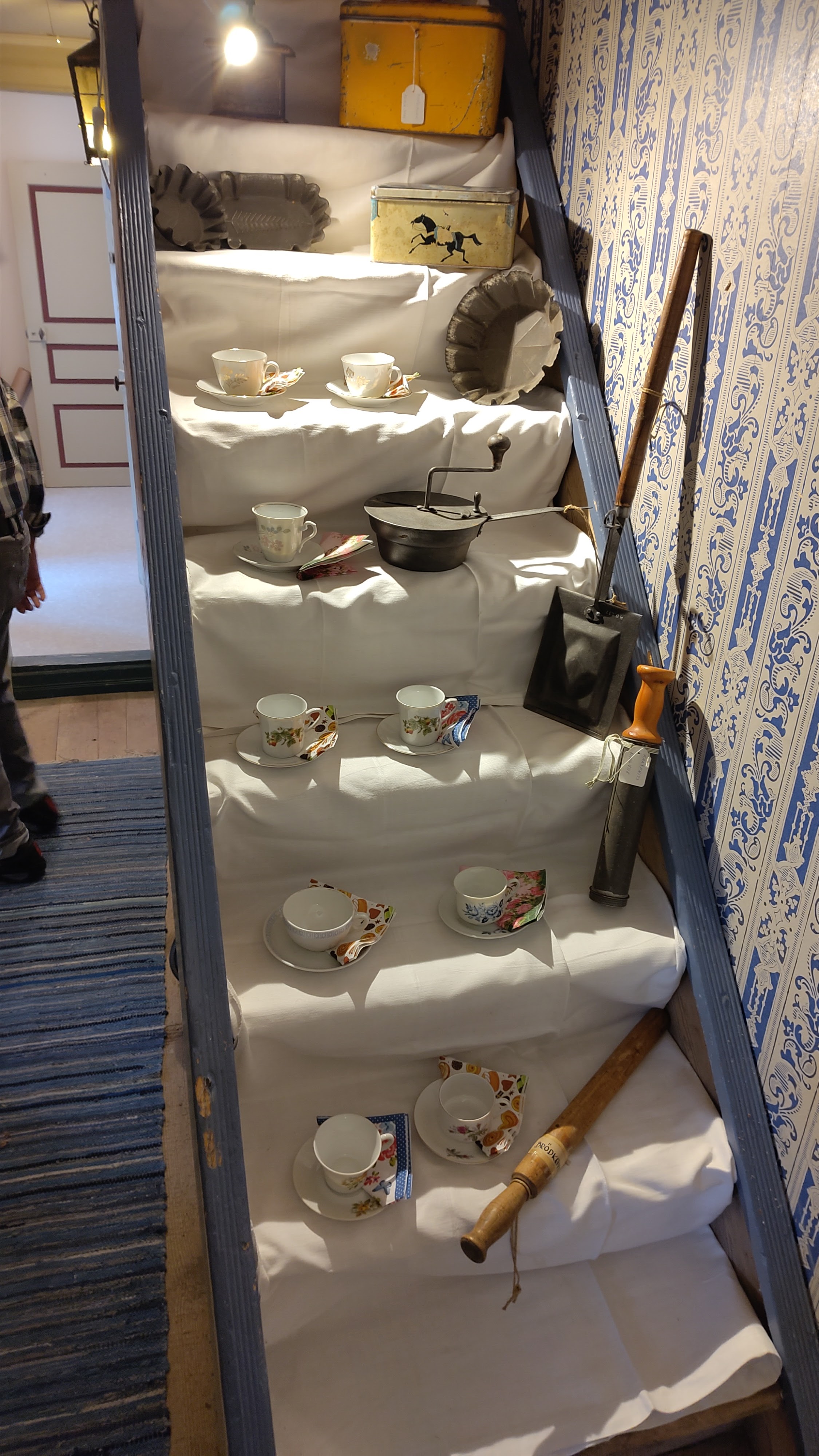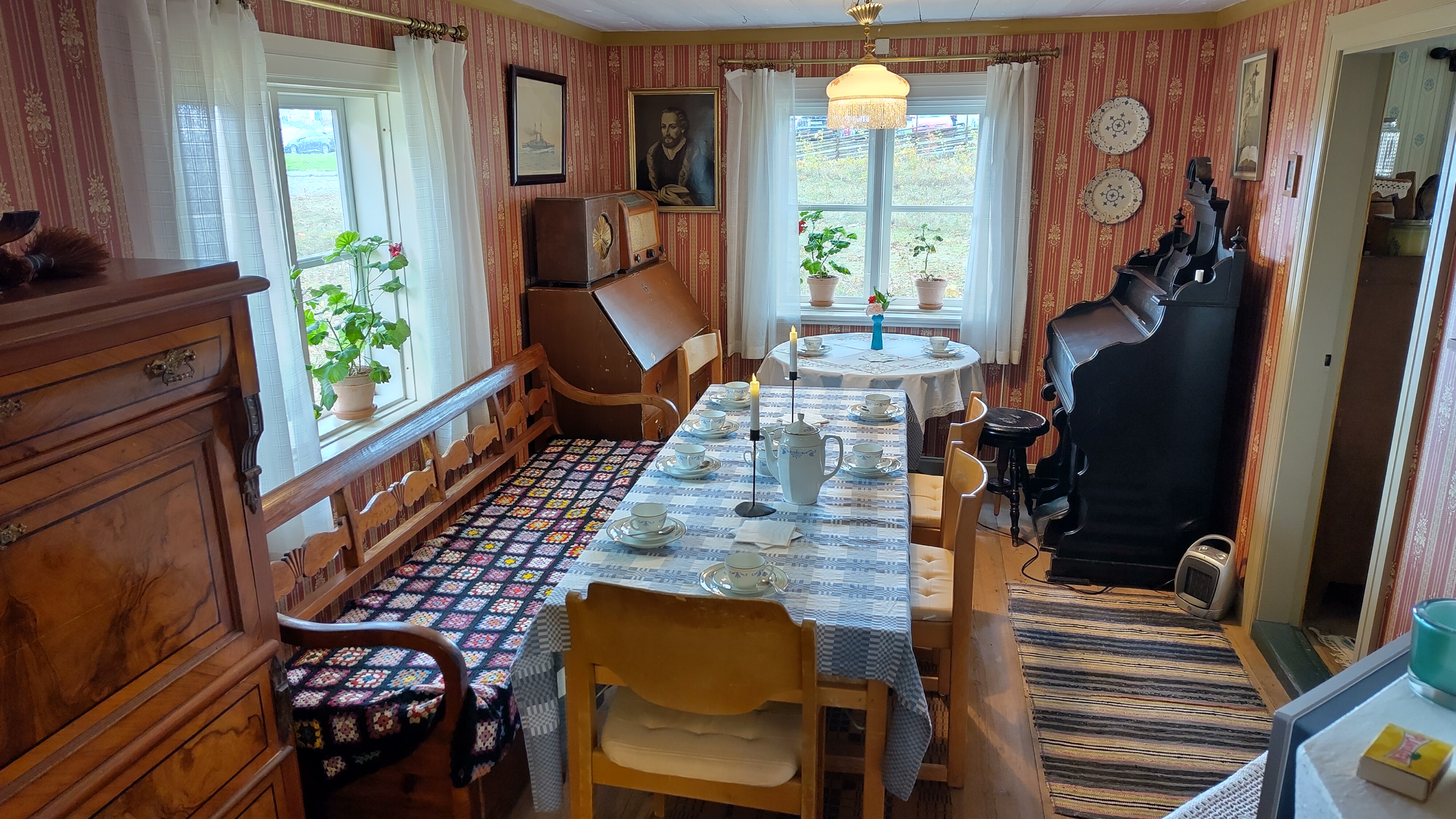 Naturligtvis stannade dock inte evenemanget vid det. Våra besökare möttes också av ett uppdukat kakbord bestående av den traditionella kafferepsetikettens sju sorters kakor samt tårta, och därtill ett bord med glutenfria alternativ. Men också inte mindre än nio bord fördelade på tre rum, dukade med anrikt porslin samt vävda och broderade dukar. Bland det mest iögonfallande i den bemärkelsen var kanske det vackra porslinet som dagen till ära kom till användning. Dock fanns det även enklare sätt att inmundiga fika: På förfrågan serverades en bricka med godsaker och kaffetermos på bänken framför Stena-Gustavs stuga. 🙂