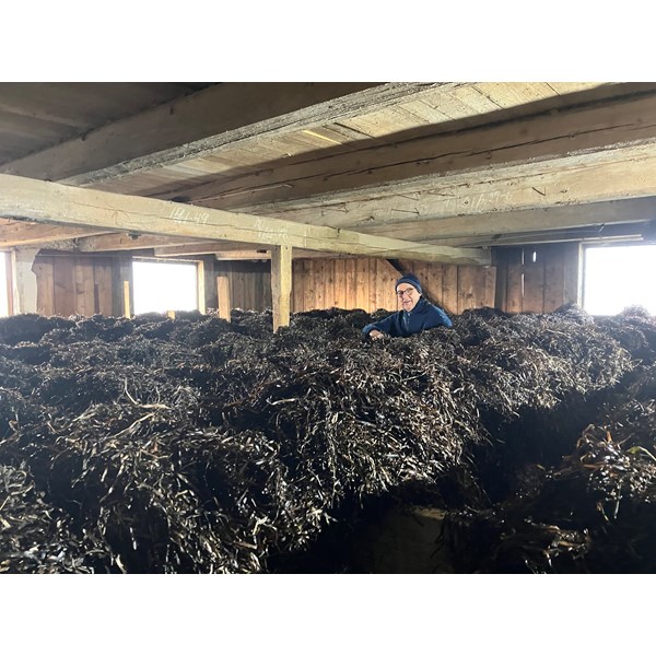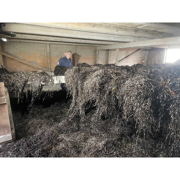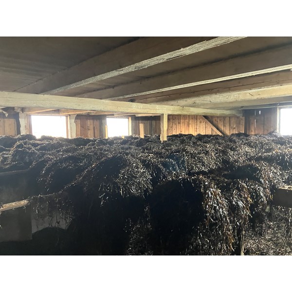 Ännu en vändning av ålagräset som hässjats i ladugården på Klasa som vi hoppas ska torka och kunna användas vid takrenoveringen på Bolsestugan till våren.