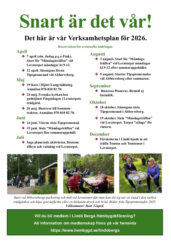 Maj: 3 Tips 2, 4 Måndagsträff, 10 Tips 2, 11 Måndagsträff, 17 Tips 2, 18 Styrelse, 18 Måndagsträff, 19 HLR-kurs, 24 Tips 2, 24 Svenska Kyrkan gudstjänst, 25 Måndagsträff, 26 Resa till Sommentrakten, 31 Tips 2