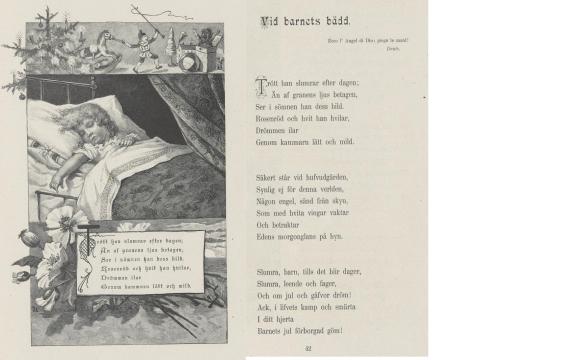 Varje julafton, så snart det blev så ljust att vi vågade, skulle vi till Gröndal och få julklappar. Som var mycket enkla. Ont om kontanter var det gott om i Gröndal, men det var klappar som var skänkta av hjärtat. Jag har fortfarande kvar en gammal bok med ängladikter där bladen var bläddrade åtskilliga gånger med snusfuktiga fingrar. Det var min julklapp ett år. Bättre begagnad. Jag kan än känna glädjen när jag bläddrar i boken, som jag säkert inte begrep så mycket av på den tiden; om jag ens gör det i dag. Men det var Oskars julklapp och mycket värdefull för mig än i dag. Det var julen 1934. Boken hette "Vid juletid" och var av C D af Wirsén med teckningar av Jenny Nyström. Jag kommer att bifoga lite smakprov på en följande sida. Den är konstigt nog utgiven i Chicago, men utan att årtalet är angivet.