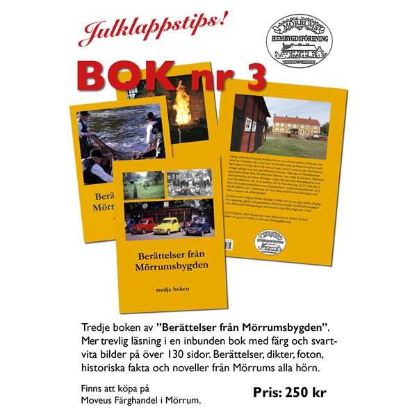 Mycket trevlig läsning i en inbunden bok, med färg- och svartvita bilder. Boken innehåller över 130 sidor. Du får berättelser, dikter, foton, historiska fakta och noveller - allt från Mörrums alla hörn!