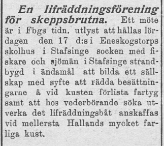 Bara en månad efter stormen, i oktober 1903, hölls ett första möte ”med fiskare och sjömän i Stafsinge strandbygd” i Skogstorps skola. Målet var från början klart: att starta ”en livräddningsförening för skeppsbrutna” och att stationera en livräddningsbåt ”vid mellersta Hallands mycket farliga kust”.