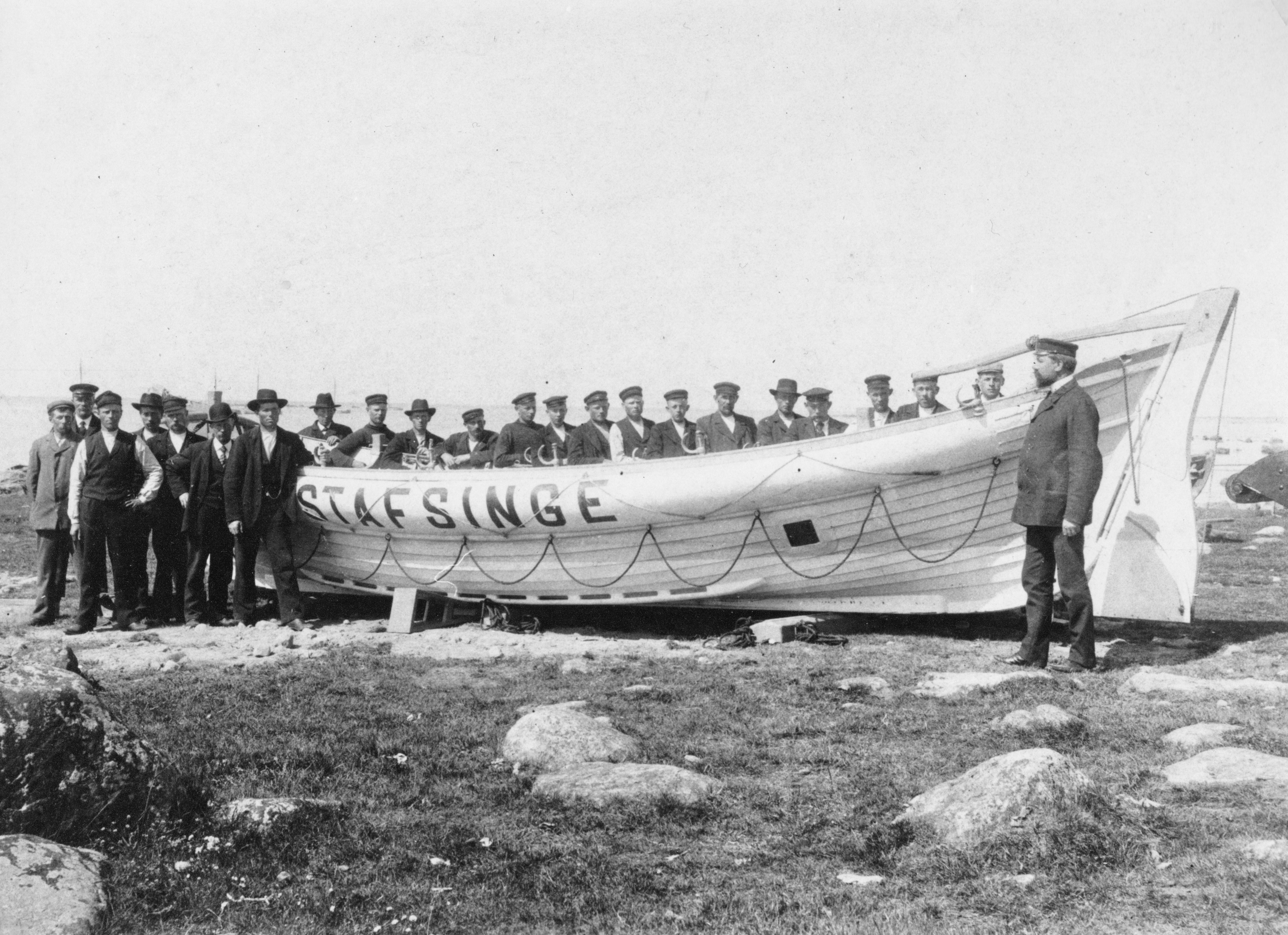 De var 24 stycken, de Stafsingefiskare, som 1904 blev påkostade en kollektiv olycksfallsförsäkring för att de var beredda att bemanna den livräddningsbåt som skulle placeras vid Skomakarehamnen. Båten som anlände våren 1906, byggd på örlogsvarvet i Köpenhamn, var försedd med centerbord och segel, men framför allt avsedd att i hårt väder och grunda vatten framföras av tio stabila roddare.