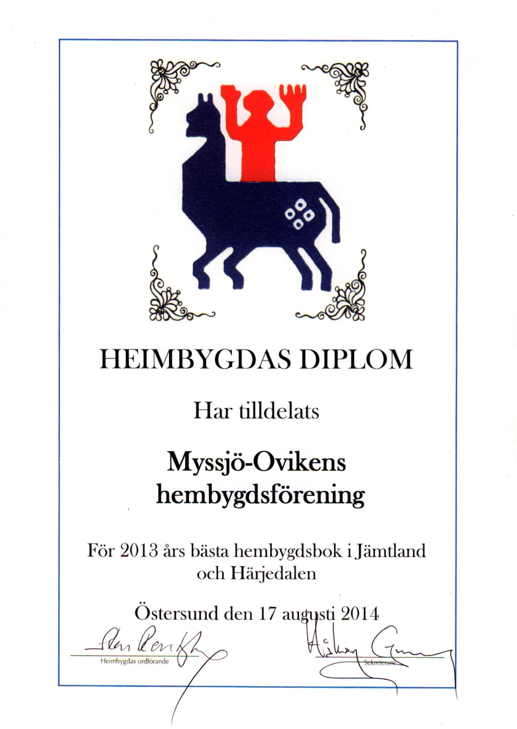 Heimbygdas diplom har tilldelats Myssjö-Ovikens hembygdsförening för 2013 års bästa hembygdsbok i Jämtland och Härjedalen. Den prisbelönade boken är ”Oviks-och Myssjöbygden 2012. Årgång 56”.