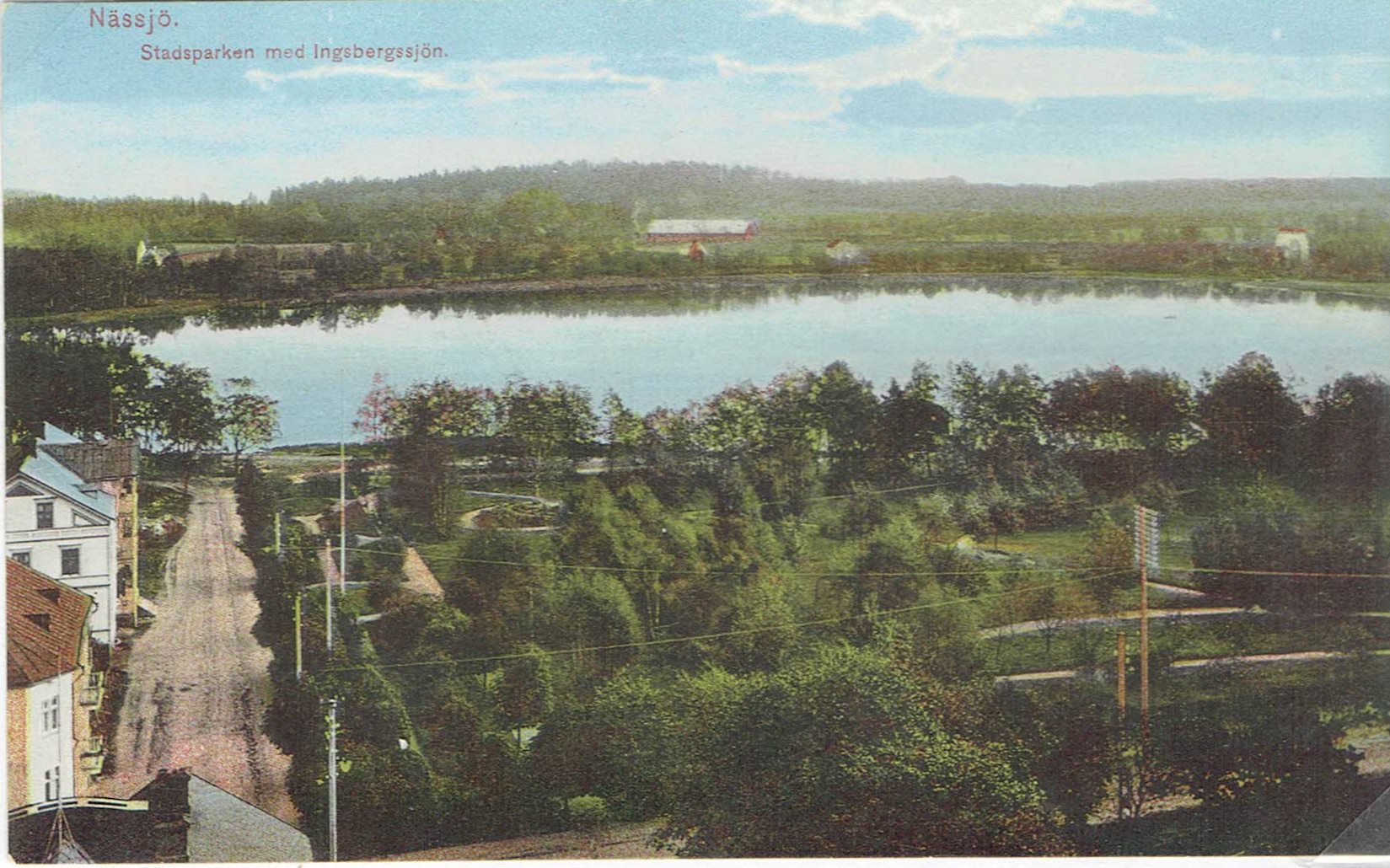 Vy över Stadsparken. Ingsbergsgårdens ladugård i bakgrunden