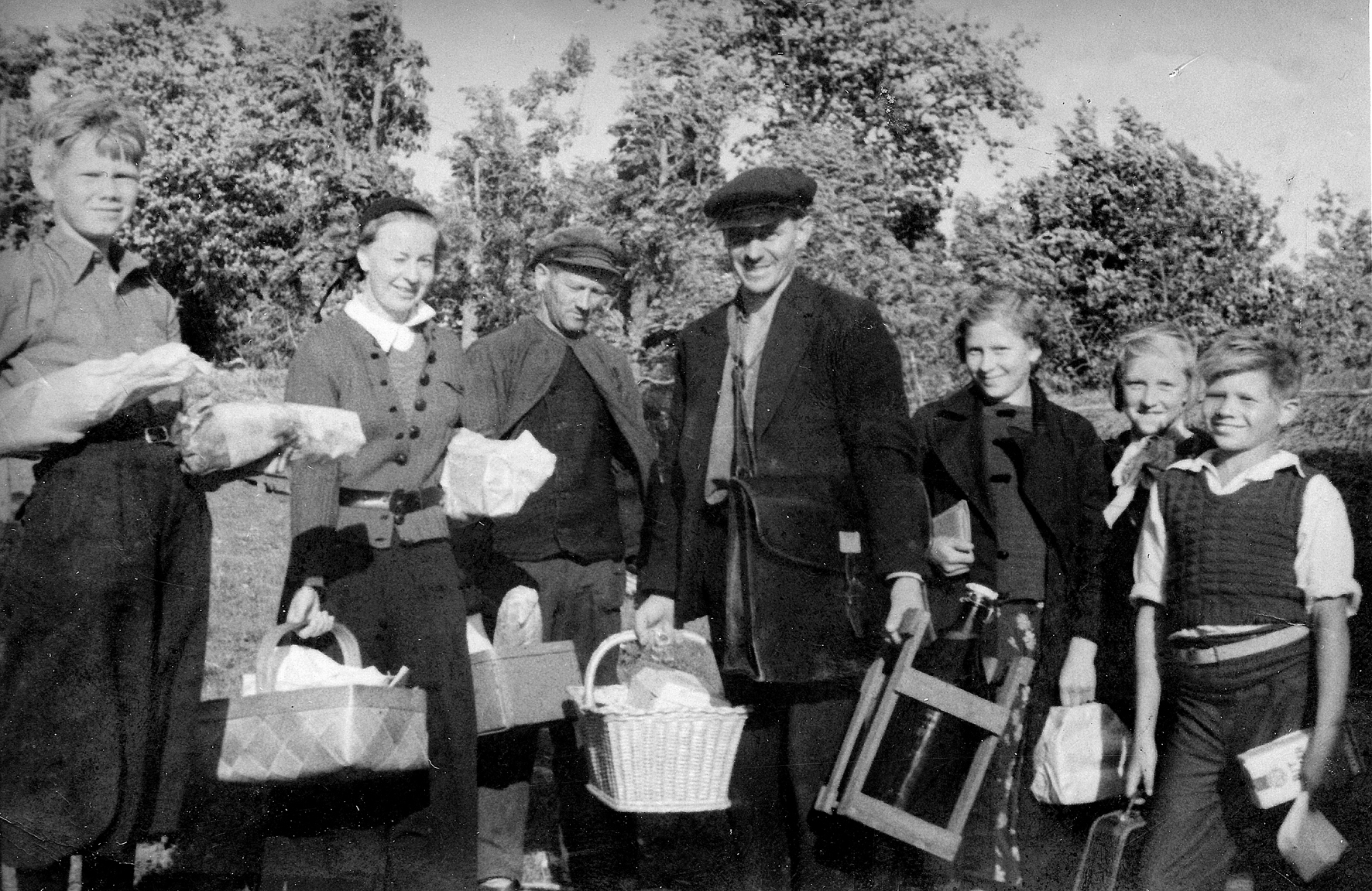 Hemkomna från affären i Älvsnäs, fr.v. nn, nn, John Sporrong, Albert Persson, Karin och Astrid Westerlund samt Robert Lindberg, obs varor i korg och dricka i krus