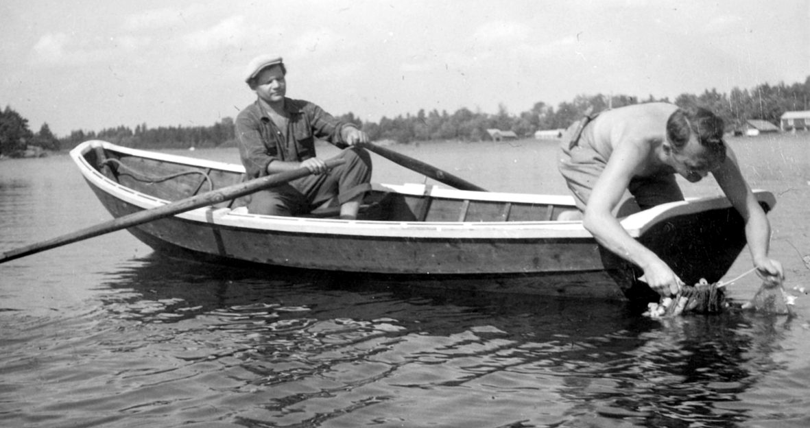 Robert LIndberg hanterar årorna medan sommargästen Hjalle Egerland vittjar näten