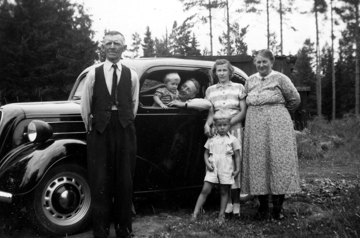 Familjen Åke Eriksson i Svartnö visar upp sin nya bil i slutet av 1950-talet. Fr.v. David Westerlund, i bilen Mats-Ola med pappa Åke, Karin med Börje och mor Signe Westerlund
