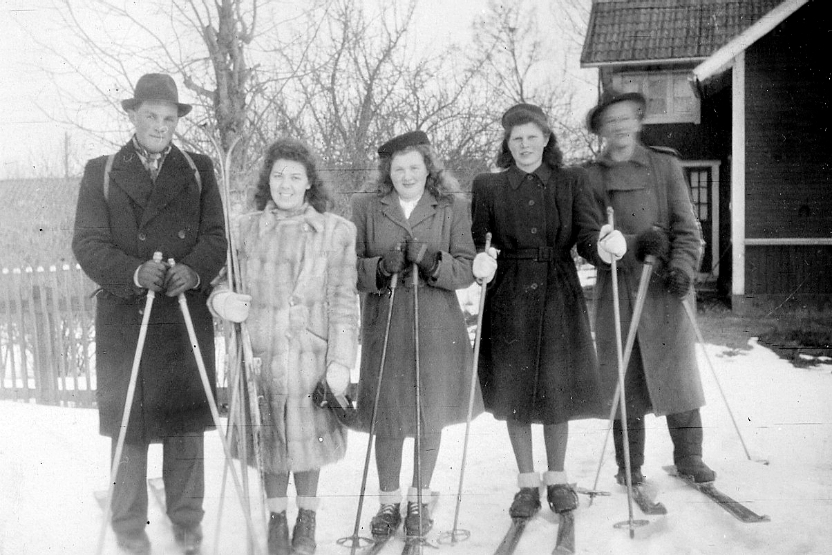 Kommit hem från äggsexa i Långalma påsken 1947, fr.v. Henry Jansson, Maj Jansson, Ing-Marie Jansson, LIlly LIndberg och Yngve Sporrong.