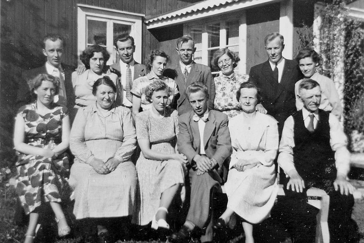 Bröllopsgäster samlade dagen efter 1 juni 1952. Stående fr.v. Henning Keisu, Linda (hembiträde till H Hjortberg), Helge Hjortberg, Karina Eriksson, Valter och Mary Westerlund, Helge och Karin Westerlund.