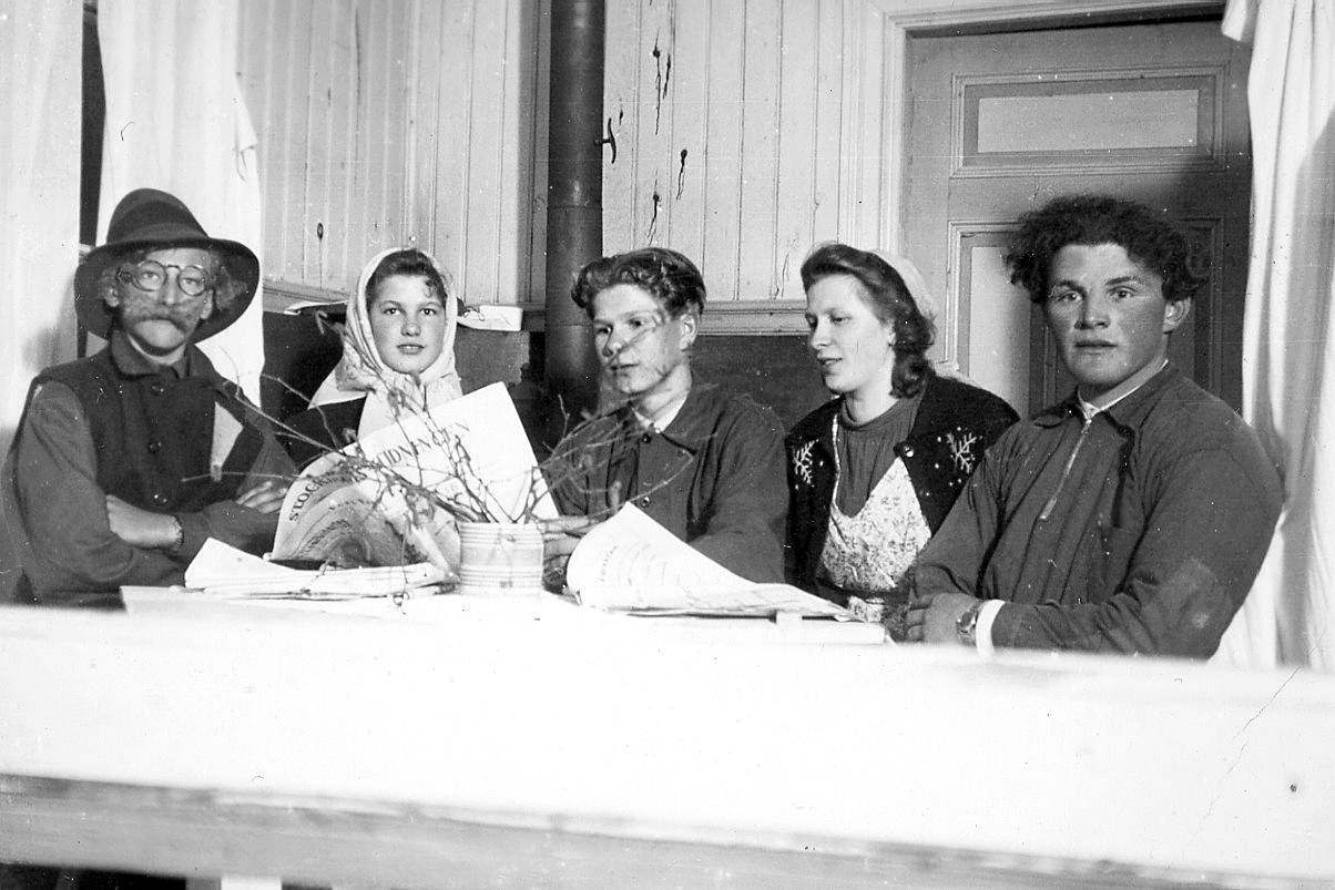 Ett riktigt teatergäng på Raggarö 1945, fr.v. Yngve Sporrong, Inga och Erik Andersson, Karin Westerlund och Henry Jansson.