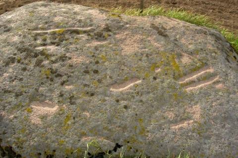 I Glömminge invid vägen Vassmolösa-Arby. Älvkvarnsstenar och Kalmar kommuns enda "hällristning".