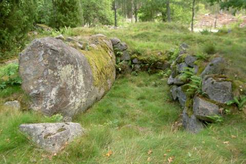 I fortsättningen kommer stigen till "gamla" Stackavägen, som man följer nedför backen kantad av låga stenmurar. Strax kommer man till resterna av det torp, som låg här. Nu kommer man ut på en större väg, som leder förbi de enorma odlingsrösen, som torparen under 50 års tid skapade, när han odlade upp de åkerstycken som ligger runt om dem. Prova att lyfta en sten och föreställ er det arbete, som här lagts ner!