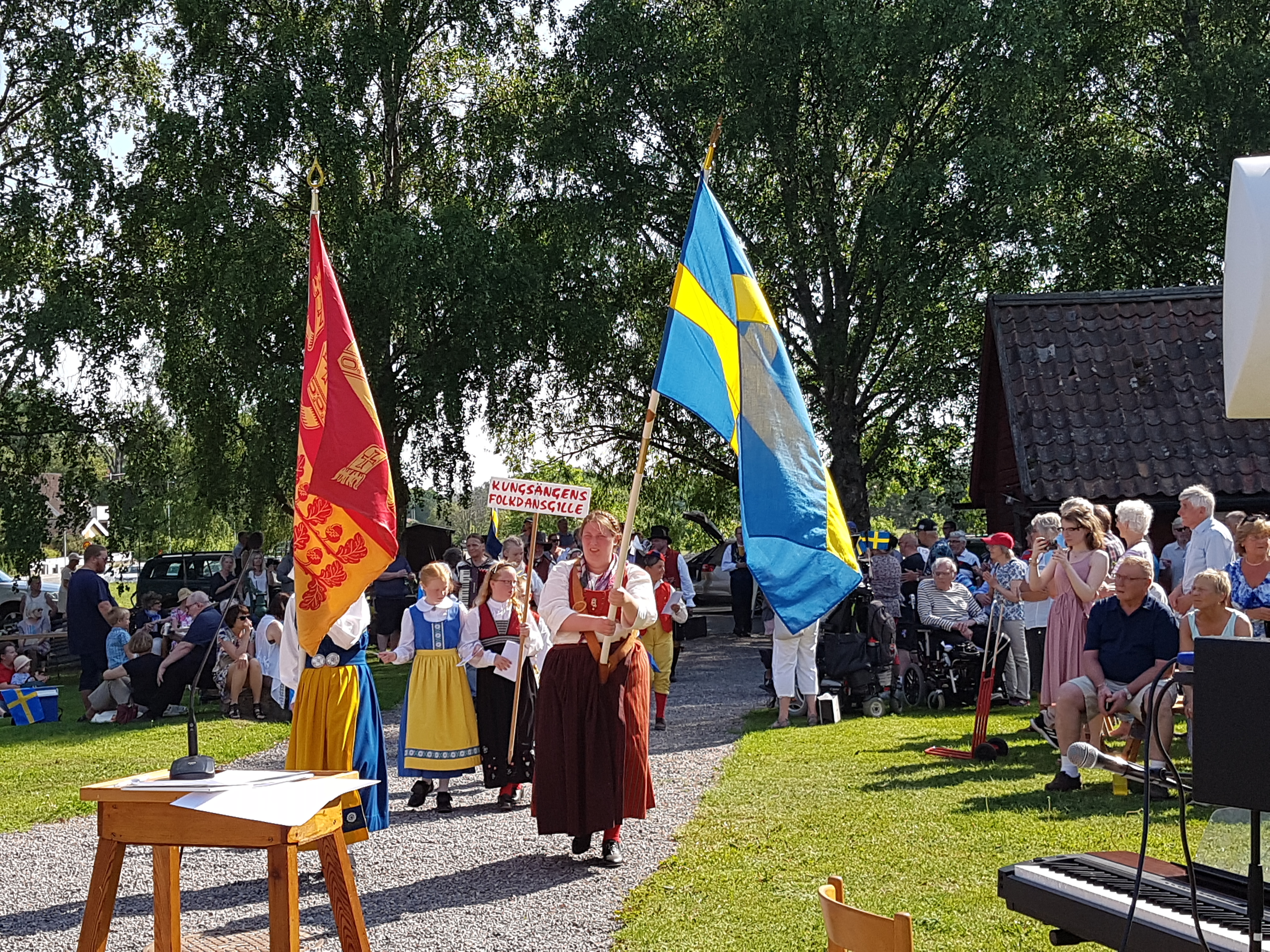 Ett högtidligt tåg från Kungsängens centrum till Hembygdsgården inleder Nationaldagsfirande.
