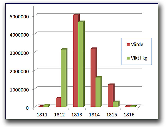 Här visas det enorma uppsvinget i handeln under några år. Röd stapel är värdet i kronor av den samlade exporten, medan grönt visar enbart vikten på socker och kaffe. Den låga siffran för 1811 berodde på det utropade "kriget" med England.